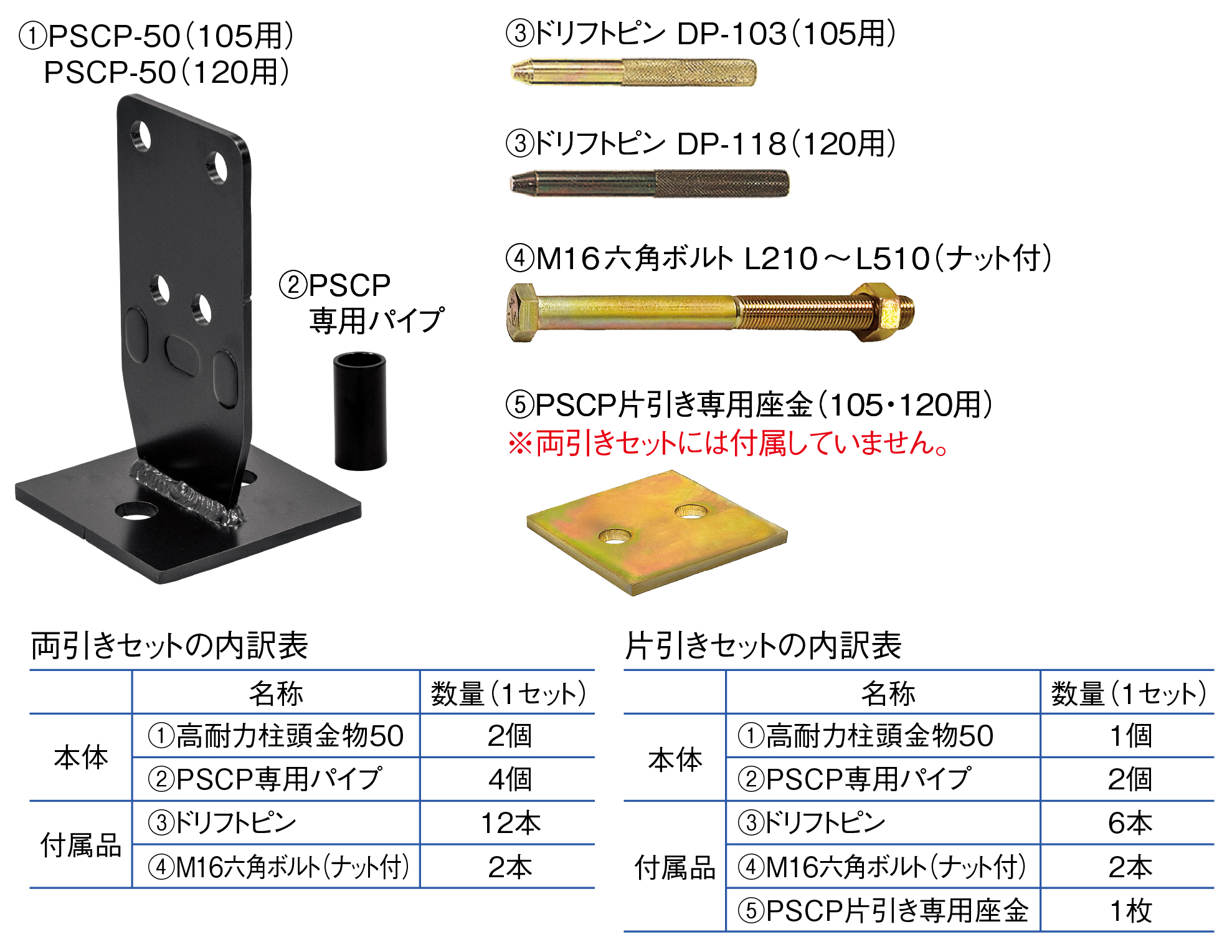 | 付属品 | ドリフトピン×12本、M16六角ボルト(ナット付)×2本、PSCP片引き専用座金×1枚 |
