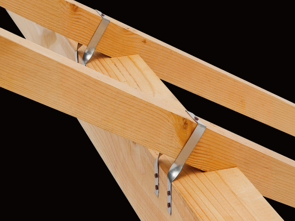 屋根が風圧で吹きあげられないよう、たる木に帯をまわして緊結する金物です。板厚および材質の変更により、従来品よりも高い耐力を実現しました。