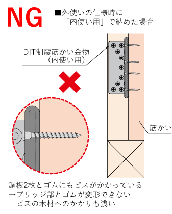 DIT制震筋かい金物は「内使い用」と「外使い用」がありますが、なぜ2種類あるのですか。間違ってつけるとどうなりますか。