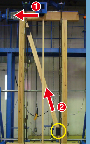 桁・胴差と柱が水平方向に移動し、筋かいが引っ張られると金物の