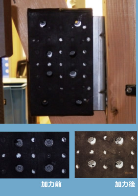 ![]() 筋かいに接している面のみ引っ張られるため、筋かいに接しているビスと、接していない穴の位置がずれます。 |