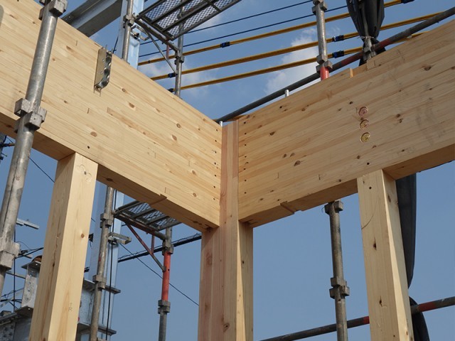地下に公共交通機関があるため木造が採用された耐火構造3階建ての施設。特別養護老人ホームと認可保育園が併設されており、地域の方も利用できる地域交流スペースが設けられている。保育室のスパンは8m、柱や壁のない190㎡の大空間となっている。敷地の都合で空調室外機や受電設備などの設備機器を屋上に設置したことで重量が重くなったが、水平力を負担させる耐力壁を高耐力のものとし、配置を工夫することで解決した。荷重及びスパンが大きいため梁・柱断面が大きく、梁受金物は梁成600までは規格品、梁成600を超える箇所には製作金物を用いた。