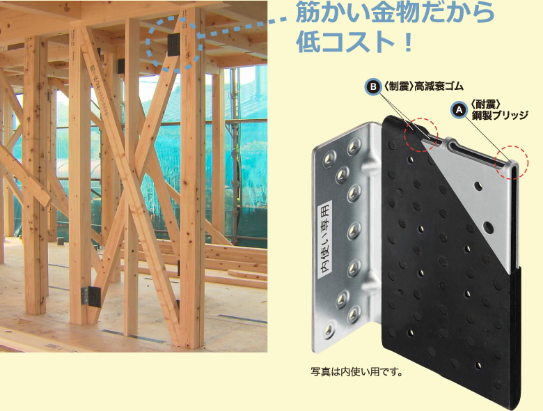 木造住宅の耐震要素で重要となる筋かい金物に着目。筋かい金物と高減衰ゴムによる制震機能を組み合せたシンプルな